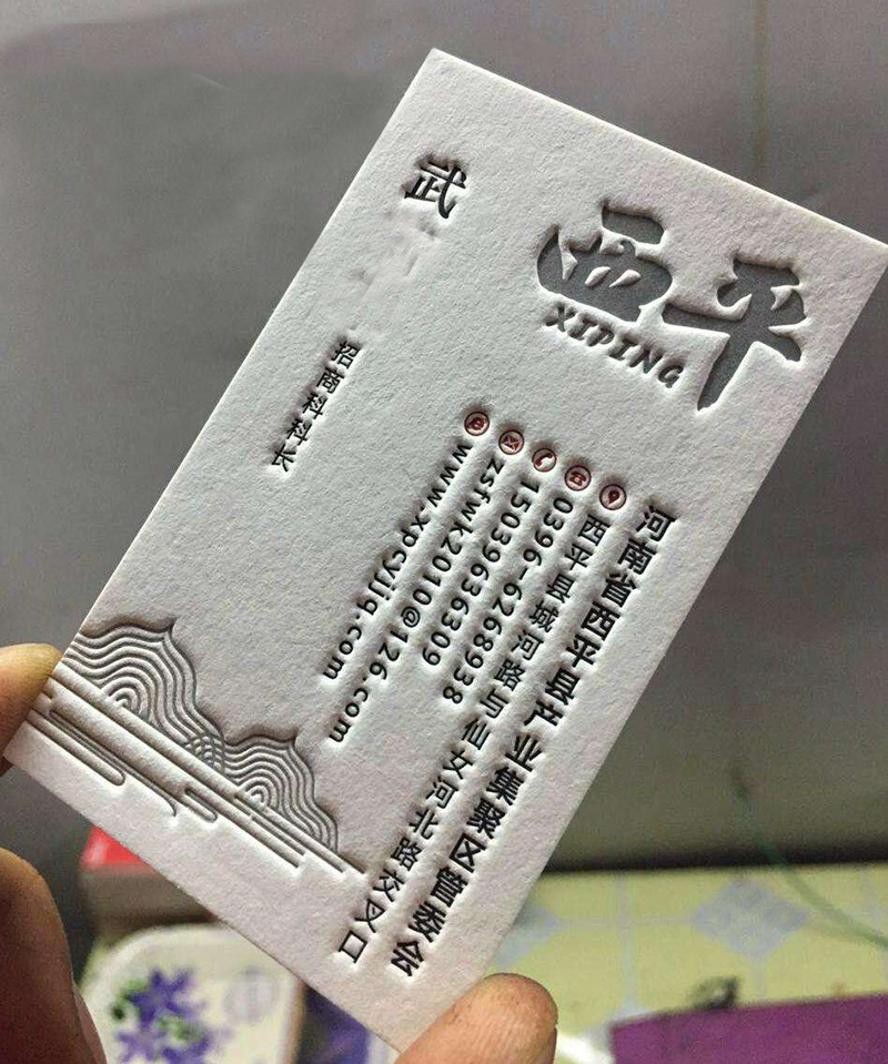 ???????這次要介紹的是擊凸名片,也可以稱作浮雕名片。這類擊凸名片多采用凹凸銅板或電雕制版工藝,通過壓印、散粉、加熱、冷卻及后加工工序等方式制成??蔂C金、可上粉(水晶名片),多采用不同的特種紙來制作名片,以凸凹字為主,亦可花紋浮雕,使得名片生動美觀,富有立體感。上手觸感明顯,簡約而不簡單,是高檔名片的代表之一。具有濃濃的商務(wù)風(fēng),藝術(shù)風(fēng)。特別適合經(jīng)貿(mào)商務(wù),上層社交,藝術(shù)設(shè)計人士使用。