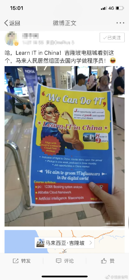 近日,有位在馬來西亞旅行的中國游客在微博上發(fā)布了一張有趣的宣傳單。并配上感言,馬來人民居然組團(tuán)去國內(nèi)學(xué)程序猿! 內(nèi)容是一家馬來西亞中介機(jī)構(gòu)提供馬來人到中國去學(xué)習(xí)中國AI技術(shù)的服務(wù)。沒錯(cuò),是一張留學(xué)培訓(xùn)宣傳單。但乍一看, 還以為健身房傳單,難道設(shè)計(jì)師從藍(lán)翔嗎。內(nèi)容到是較吸引人,介紹中不光強(qiáng)調(diào)0基礎(chǔ)速成,而且還以—年入50萬馬幣以及3年就能買房為噱頭!中國作為人工智能領(lǐng)域的“新貴”,開始吸引老外組團(tuán)來當(dāng)程序員了!彩印宣傳單