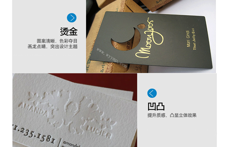 ? ? ? 無論是數(shù)字印刷還是傳統(tǒng)印刷,配套的印后工藝不可相互替代。如數(shù)字印刷配套的印后工藝有數(shù)字切割、激光雕刻、數(shù)字式燙印等技術(shù);傳統(tǒng)印刷配套的印后工藝有模切、套色或不套色的擊凸、壓凹、各種電化鋁燙印等,合理地運(yùn)用這些工藝,會(huì)令名片“錦上添花”;應(yīng)用不合理,將會(huì)是“畫蛇添足”,筆者建議印后工藝不可堆砌,一款名片,配合1~2個(gè)印后工藝為宜?! ?/span>